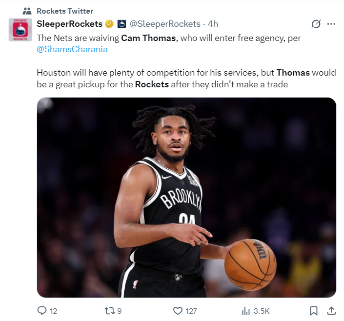 火箭队记兰德里-宾克利透露,如果能有像托马斯这样的球员加入买断市场,那对火箭队来说将会是重大利好。但问题是,会有很多球队争抢他,而不仅仅是火箭队一家。